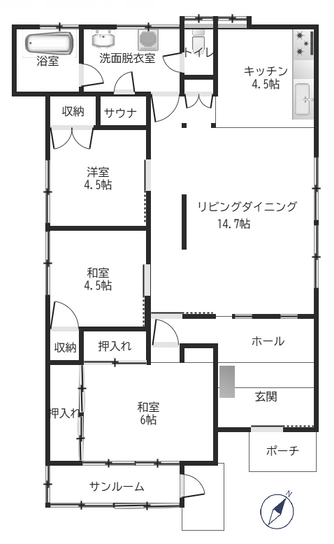 サンルーム、サウナ付きの使いやすい戸建